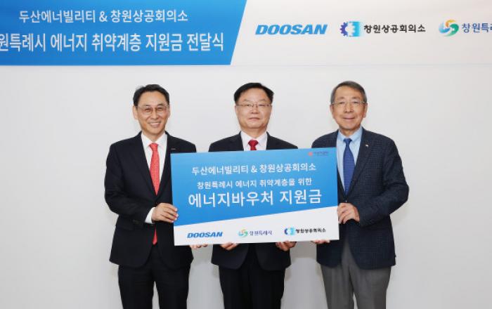 두산에너빌리티가 창원상공회의소와 공동으로 창원 지역 에너지 취약계층의 따뜻한 겨울나기를 돕는 나눔을 실천했다. 두산에너빌리티는 16일 창원공장 게스트하우스에서 ‘창원특례시 에너지 취약계층 지원금 전달식’ 행사를 열고, 8000만원을 창원시에 전달했다. 이날 전달식에는
