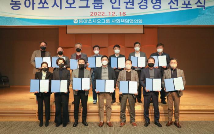 동아쏘시오그룹이 16일 서울시 동대문구 용두동 본사에서 인권경영체계 정착을 위한 인권경영을 선포식을 개최했다고 19일 밝혔다.이번 선포식에는 정재훈 동아쏘시오홀딩스 대표이사를 비롯해 동아에스티, 동아제약, 에스티젠바이오, 에스티팜, 용마로지스, 동천수, 아벤종합건설,