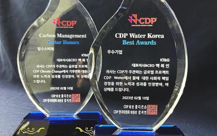 KT&G가 글로벌 환경정보 평가기관인 CDP(탄소정보공개프로젝트)로부터 기후변화 대응·수자원 관리 부문 우수기업(Leadership 등급)으로 선정됐다. KT&G는 지난해에 이어 기후변화 대응·수자원 관리 두 분야 모두에서 Leadership에 해당하는 상위 등급을