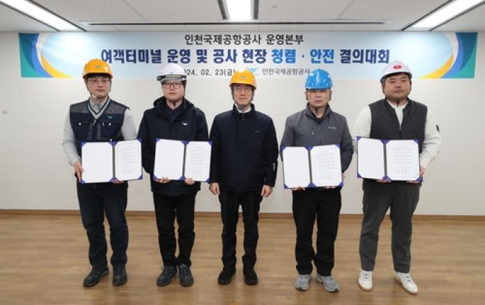 인천국제공항공사는 23일 인천국제공항 제1여객터미널 CS아카데미에서 '여객터미널 운영·개선공사 현장 청렴·안전 결의대회'를 개최했다고 밝혔다. 이날 오전에 열린 행사에는 인천국제공항공사 유구종 운영본부장을 비롯해 인천공항시설관리(주), 항공사, 조업사, 면세점, 상
