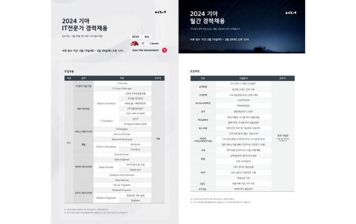 기아는 2월 29일(목)까지 채용 홈페이지를 통해 정보기술(IT) 부문을 비롯한 각 분야에 대해 두 자릿수 규모의 경력직 우수 인재 채용에 나선다고 19일(월) 밝혔다. IT 부문 내 채용 직무는 총 16개로 ▲IT 개발 ▲IT 관리·기술