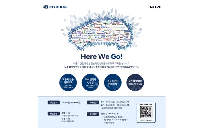 현대자동차·기아가 협력사 인재 채용에 대한 모집부터 교육, 인턴십, 채용 연계까지 논스톱으로 지원해 주는 동반성장 프로그램 'Here We Go(히어 위 고)'를 실시한다고 23일(금) 밝혔다. 'Here We Go'는 모빌리티 산업에 관심 있는