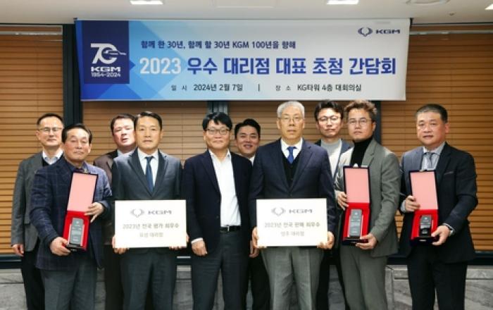 KG 모빌리티(www.kg-mobility.com, 이하 KGM)가 2023년 판매 우수 대리점 시상과 함께 대리점 대표들과 간담회를 갖고 현장 의견을 청취했다고 밝혔다. 금일 오전 KG 타워에서 열린 행사에는 KGM 정용원 대표이사와 국내사업본부 김광호 본부장을