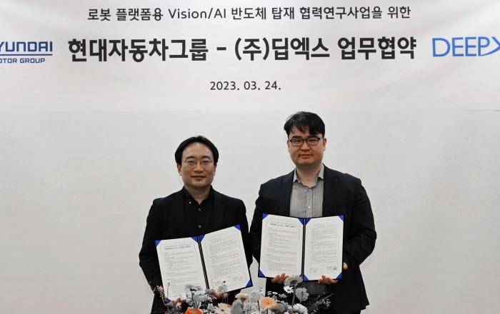 현대자동차∙기아가 최첨단 로보틱스 서비스 개발을 위해 AI 반도체 전문 기업과 손을 잡는다. 현대자동차∙기아는 24일(금) 의왕연구소에서 로보틱스랩장 현동진 상무와 딥엑스(DEEPX) 김녹원 대표이사 등 양사 관계자들이 참석한 가운데 ‘로