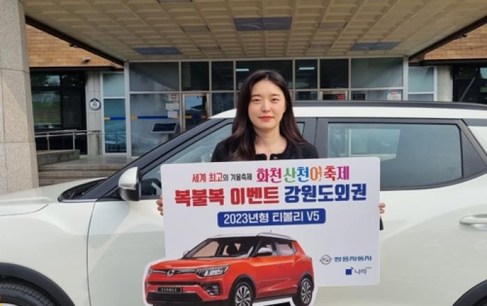 쌍용자동차가 후원하는 한국의 대표적 겨울 축제 '2023 화천 산천어 축제'의 현장 응모 이벤트에서 행운을 거머쥔 당첨자에게 티볼리 경품 전달식을 진행했다고 9일 밝혔다. 지난 8일 강원도 화천군청에서 추한빈 쌍용자동차 경기/강원지역본부장과 최문순 화천군수 등 관계