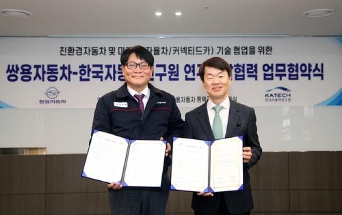 쌍용자동차가 한국자동차연구원(이하 한자연)과 친환경차와 미래차 연구개발 및 기술교류 등 상호 간 협력 강화를 위한 MOU(양해각서)를 체결했다고 27일 밝혔다. 지난 24일 쌍용자동차 평택 본사에서 열린 협약식에는 쌍용자동차 정용원 대표이사와 권용일 연구소장, 한자