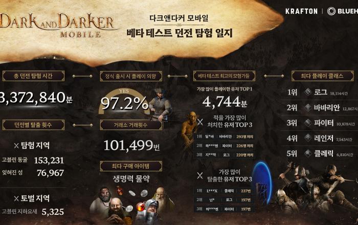 (주)크래프톤이 산하 크리에이티브 스튜디오 블루홀스튜디오가 개발 중인 신작 ‘다크앤다커 모바일(DARK AND DARKER MOBILE)’의 첫 대규모 테스트를 성공적으로 마치고 주요 기록을 공개했다. 다크앤다커 모바일의 첫 대규모 테스트는 지난 4월 24일 화요일