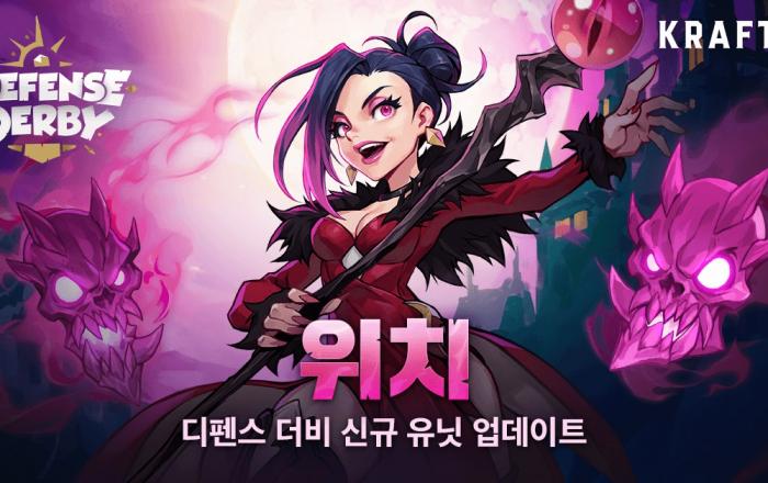 ㈜크래프톤의 독립 스튜디오 라이징윙스가 실시간 전략 디펜스 모바일 게임 ‘디펜스 더비(Defense Derby)’의 10월 업데이트를 진행했다. 이번 업데이트를 통해 인간 종족의 마법 속성 유닛 ‘위치’를 선보였다. 위치는 금지된 마법에 사로잡혀 타락한 마법사로