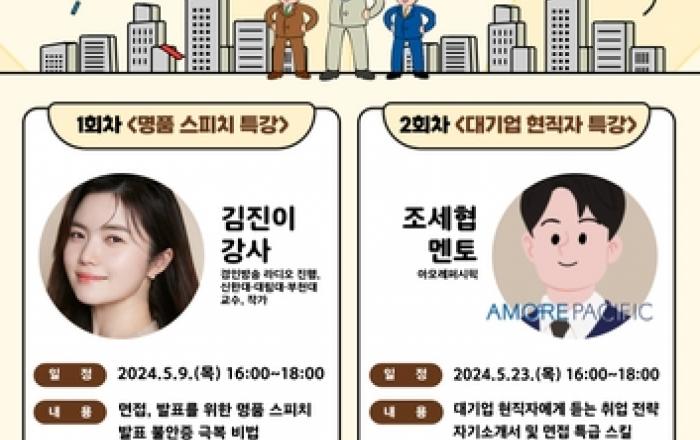 인천 연수구는 내달 9일과 23일 구청 별관 연수청년자리에서 청년을 위한 '명품 스피치 및 대기업 현직자 청년특강'을 개최한다. 내달 9일에 열리는 연수청년자리 '청년특강' 1회차에서는 '어른의 말 습관' 저자이자 경인방송 라디오를 진행 중인 김진이 강사가 '면접