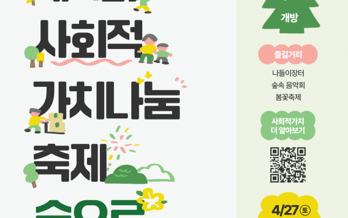 세종특별자치시가 ‘제4회 사회적 가치나눔 축제, 숲으로’ 행사를 오는 27일 토요일 오전 9시부터 오후 6시까지 국립세종수목원 축제마당에서 개최한다. 사회적 가치나눔 축제는 시민을 대상으로 사회적경제 가치를 확산하고 사회적경제 홍보를 통한 기업 경쟁력
