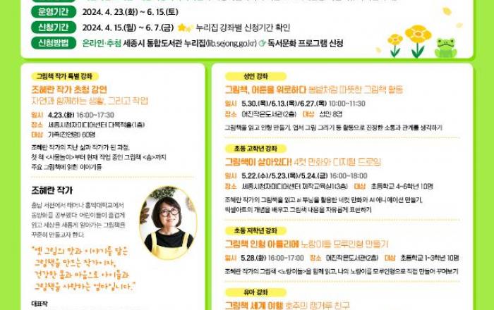 세종시립도서관이 임수경 동화 작가, 조혜란 그림책 작가, 이정록 시인 등을 초청해 시민 대상 독서문화 프로그램을 운영한다. 이번 도서관 작가 초청 강연은 도담동도서관 ‘미술’, 어진작은도서관 ‘그림책’, 전의나무도서관 ‘조경수 마을’ 등 각 도서관의 특