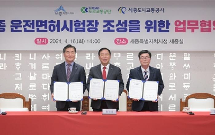세종시에 운전면허시험장 조성에 탄력이 붙을 전망이다. 세종특별자치시(시장 최민호)는 16일 오후 2시 시청 접견실에서 도로교통공단(이사장 서범규), 세종도시교통공사(사장 도순구)와 세종 운전면허시험장 건립사업 추진을 위한 업무협약을 체결했다. 세종시는 전국 17