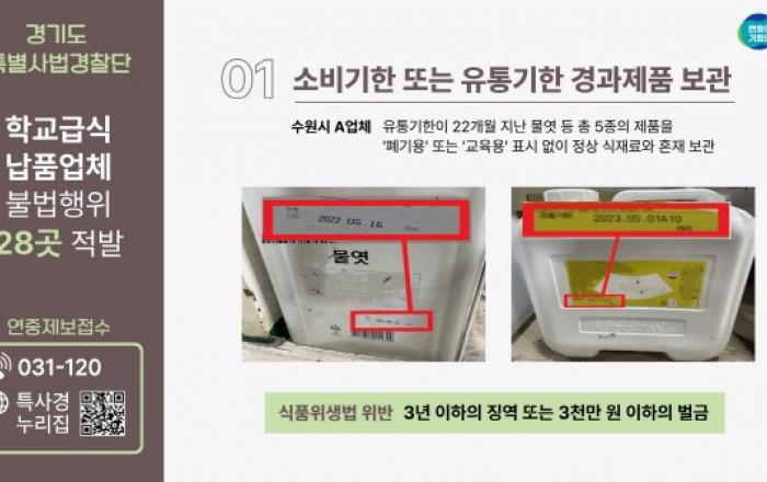 ※ 보도 자료에 공개된 범죄사실은 재판을 통해 확정된 사실이 아님을 유의해 주시기 바랍니다.(보도사유 : 동종 범죄․피해의 급속한 확산 방지) 경기도 특별사법경찰단이 개학을 맞아 지난 3월 11일부터 29일까지 학교급식 납품업체 360개소를 단