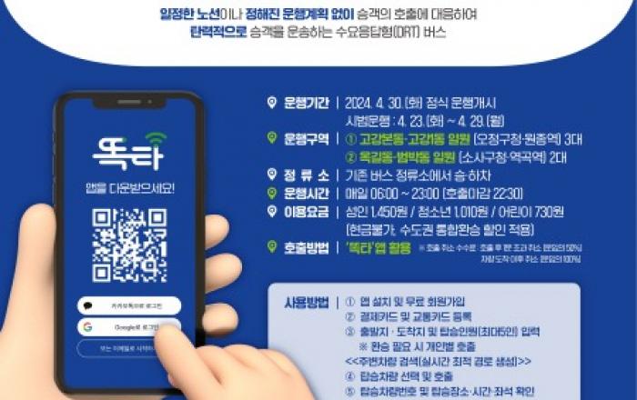 원하는 시간에, 원하는 장소에서 탑승해 원하는 목적지로 이동할 수 있는 신개념 교통수단 ‘똑버스’가 부천 범박·옥길·고강 일원에서 운행을 개시한다. 경기도와 경기교통공사는 23일부터 부천시 내 2개 운행구역 ▲범박·옥길동(2