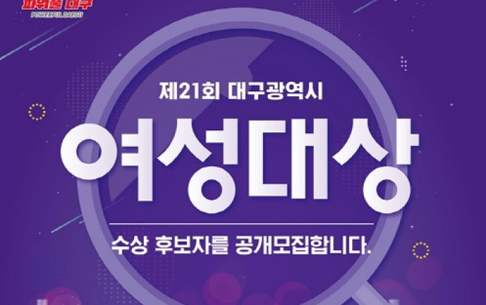 대구광역시는 여성의 지위 향상과 양성평등사회 구현을 위해 공헌한 여성을 발굴하기 위해 4월 15일(월)부터 5월 24일(금)까지 ‘제21회 대구광역시 여성대상’ 수상 후보자를 공개 모집한다. 수상 자격은 공고일 현재(4.8.) 대구광역시에 3년 이상 계속해 거