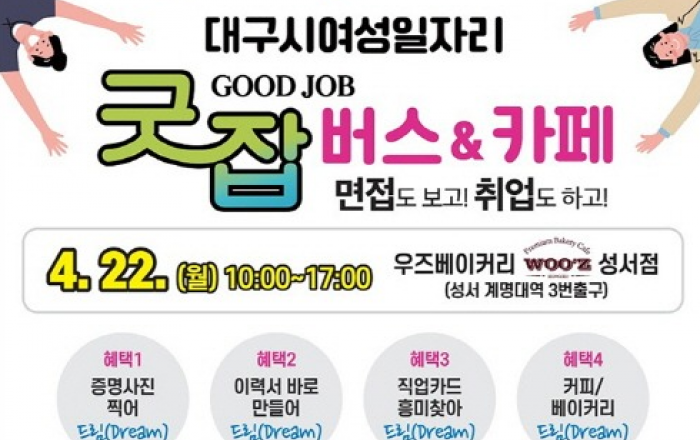대구광역시는 취업을 희망하는 경력단절 및 미취업 여성을 위해 「찾아가는 취업상담 서비스 ‘굿잡(Good Job)버스&카페’」를 오는 4월 22일(월) 오전 10시부터 우즈베이커리 카페(달서구 성서점)에서 운영한다. 찾아가는 여성일자리 ‘굿잡(Good J