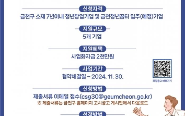금천구는 오는 7월 3일까지 '금천 청년창업가 도약 지원사업' 공모에 참여할 청년창업기업 5개 사를 모집한다고 밝혔다. '금천 청년창업가 도약 지원사업'은 성장 잠재력이 있는 지역 내 청년창업기업을 발굴해 사업화 자금을 지원하는 신규사업이다. 우수한 아이디어와