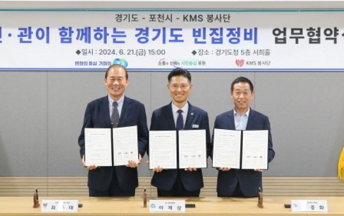 경기도는 21일 도청에서 포천시, KMS봉사단과 ‘민․관이 함께하는 경기도 빈집정비 업무협약식’을 개최했다. 이번 업무협약은 경기도의 ‘빈집정비 지원사업’ 추진 시 민간 자원봉사단체인 KMS봉사단이 참여하는 내용이다. KMS봉사단은 포천시를 비