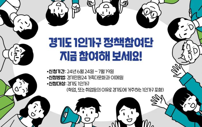 경기도는 6월 24일부터 7월 19일까지 ‘경기도 1인가구 정책참여단’ 50명을 모집한다. ‘경기도 1인가구 정책참여단’은 1인가구 도민의 정책 참여를 확대하고, 실 수요 기반 정책을 발굴하기 위해 올해 신설했다. 경기도에
