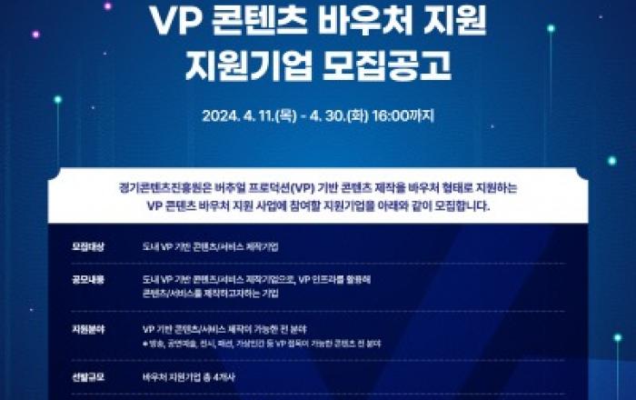 경기도와 경기콘텐츠진흥원은 버추얼 프로덕션(이하 VP) 기반 콘텐츠·서비스 제작을 지원하는 ‘VP 콘텐츠 바우처 지원’ 사업 참여 기업을 30일까지 모집한다. VP는 확장현실(XR) 등 실감 콘텐츠와 시각효과 기술을 활용한