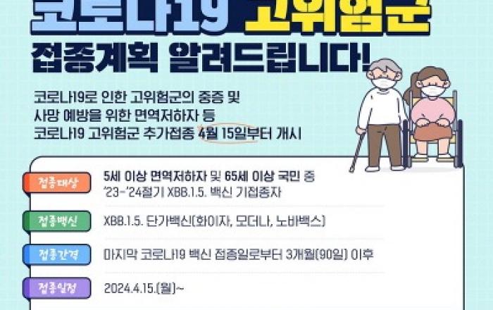 대구광역시는 오는 4월 15일(월)부터 현재 유행하는 변이에 대한 백신의 효과성, 고위험군의 짧은 면역 지속기간 등을 고려해, 고위험군을 대상으로 코로나19 추가접종을 개시한다. 이번 접종 대상은 2023~2024절기 코로나19 백신(XBB.1.5)을 접종한 65세 이