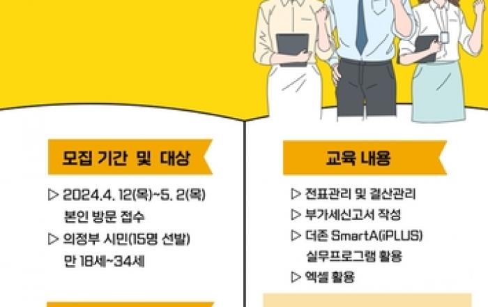 의정부시는 취업을 희망하는 청년 구직자를 위한 맞춤형 직업교육 취업프로그램 '경리사무원 양성과정'을 오는 5월 8일부터 6월 21일까지 운영한다. 참여 대상은 의정부에 주소를 둔 18세 이상 34세 이하의 청년 또는 관내 대학교 졸업예정자다. 경리사무원으로 취업을