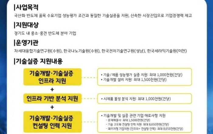 경기도와 차세대융합기술연구원이 ‘경기도 반도체 테스트베드 활용 기술실증 지원사업’에 참여할 2024년도 신규지원 대상 기업을 공모한다. 이 사업은 도내 반도체 분야 중소·중견기업을 대상으로 기술개발 과정 중 기술실증 단계에서