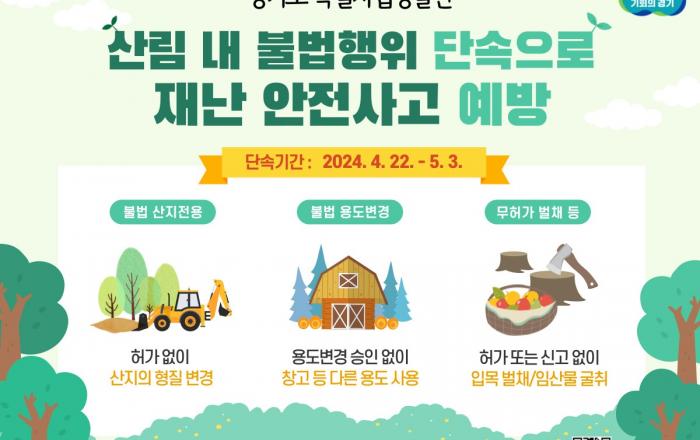 경기도 특별사법경찰단은 4월 22일부터 5월 3일까지 도내 불법 산지전용 및 용도변경, 무허가 벌채 등 산림 내 불법행위를 집중 단속한다고 9일 밝혔다. 도는 산림청에서 제공받은 산림 훼손 의심지역 86,656필지(10,556ha, 축구장 14
