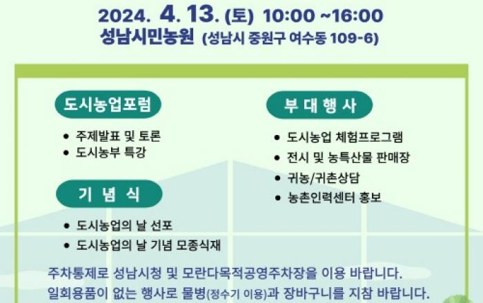 경기도가 도시농업의 날을 맞아 ‘제1회 경기도 도시농업의 날 기념 행사’를 성남시민농원에서 13일 개최한다. 도는 기후위기 시대 도시농업의 중요성을 알리기 위해 경기도 도시농업공동체와 함께 올해 처음 기념행사를 마련했다.