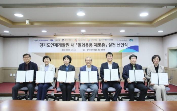 경기도인재개발원은 경기연구원, 경기관광공사, 경기도여성가족재단, 경기복지재단, 경기도평생교육진흥원, 경기사회서비스원 등 6개 공공기관과 함께 3일 경기도인재개발원에서 ‘일회용품 제로존’ 실천 선언식을 열었다. 인재개발원 일회