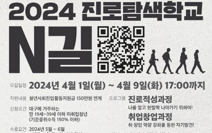대구광역시와 대구광역시청년센터는 청년에게 진로 탐색의 기회를 제공하는 ‘진로탐색학교 N길’에 참여할 청년들을 4월 1일(월)부터 9일(화)까지 모집한다. ‘진로탐색학교 N길’은 대구 거주 미취업 청년의 사회진입을 돕는 진로탐색 교육 프로그램으로, 나를 탐색하며 진로를