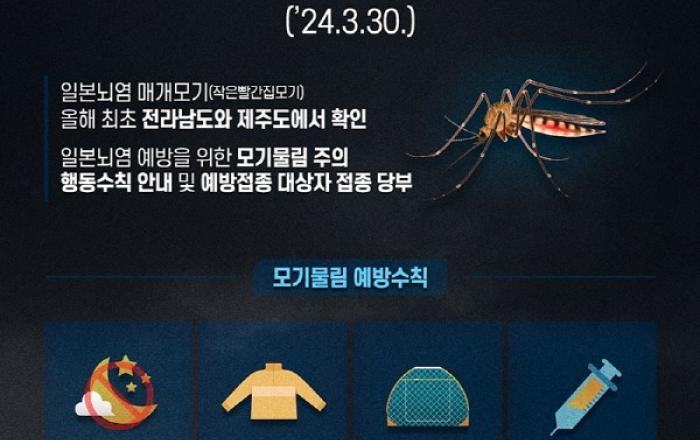 대구광역시는 3월 30일 전국에 일본뇌염 주의보*가 발령됨에 따라 일본뇌염 예방을 위한 모기물림 주의 행동수칙 준수를 당부했다. 올해 일본뇌염 주의보 발령은 작년(3월 23일)에 비해 7일가량 늦어졌는데, 이는 남부지역(부산, 경남, 전남, 제주)의 3월 평균기온이 작