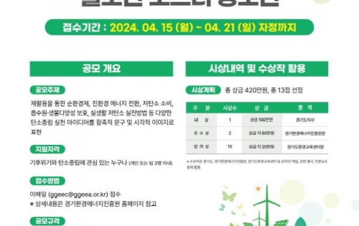 경기환경에너지진흥원은 기후위기에 대응하고 탄소중립을 위한 자발적 실천을 유도할 수 있는 시각 매체를 발굴하기 위해 2024년 ‘기후위기에 대응하는 탄소중립 실천 슬로건·포스터 공모전’을 진행한다. 이번 공모전에는 기후위기와 탄소중립에 관심 있는