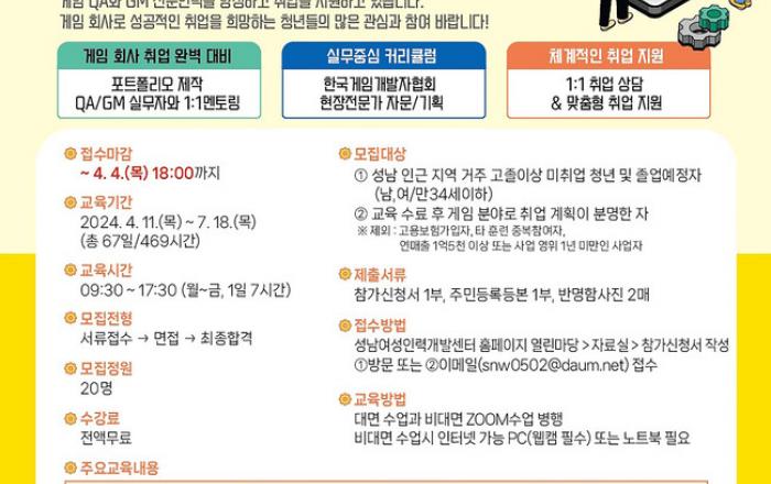 성남시가 게임분야 취업을 희망하는 19 세 이상 34 세 이하의 미취업 청년을 위한 무료 직업훈련교육을 실시한다