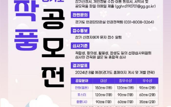 경기도가 인권신장을 위해 공헌한 ‘경기도민 인권 대상’ 후보자와 인권존중 문화 확산을 위한 ‘경기도 인권 작품공모전’ 출품작을 3월 15일부터 5월 31일까지 모집한다. ‘제3회 경기도민 인권 대상’ 후보자 추천은 경기도민 누구나 가능하며, 추
