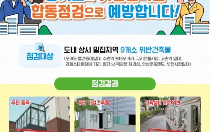 경기도는 지난 1월 24일부터 2월 29일까지 도내 9개 인파관리시스템 중점관리지역 내 위반건축물을 시군 합동 점검한 결과 무단 증축 등 위반사항 42건을 적발했다고 11일 밝혔다. 점검 대상은 오이도 빨간등대 일대, 수원역 로데오거리, 구리전