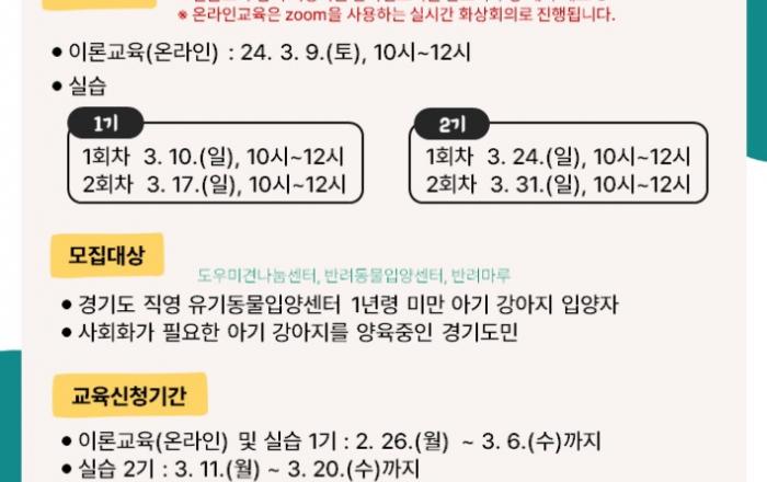 경기도가 1년령 미만 어린 강아지를 키우는 보호자를 대상으로 ‘아기 강아지 사회화교육’을 한다. 8일 경기도에 따르면 도는 3월 9일 온라인교육을 시작으로 3월 10일부터 매주 일요일 교육을 진행하며 2회차씩 1기와 2기로 나누어 운영한다. 1