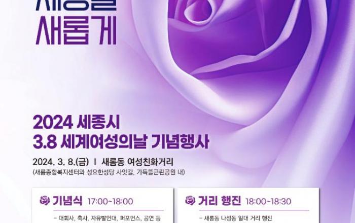 세종특별자치가 8일 세계 여성의 날을 기념해 ‘여성의 힘으로 세종을 새롭게’라는 슬로건으로 기념행사를 개최한다. 세계 여성의 날은 1908년 3월 8일 미국 뉴욕의 섬유산업 여성노동자 1만 5,000명이 생존권과 참정권을 요구하며 벌인 대규모 시위를 기