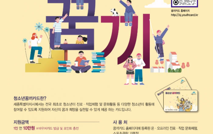 세종특별자치시가 청소년에게 진로·직업·문화·예술 등 다양한 체험활동의 기회를 제공하는 ‘꿈끼카드’를 발급한다. ‘꿈끼카드’ 사업은 세종시에서 시행하는 청소년 활동 지원사업으로 각자의 재능을 계발하고 꿈과 희망을 실현할 수 있는 청소년 특화사업이다.