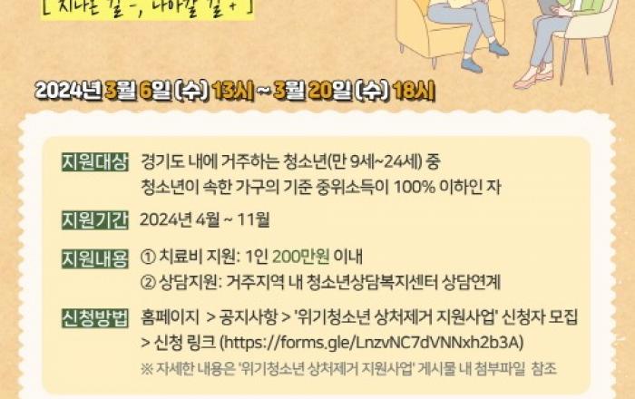 경기도가 외상으로 생긴 흉터나 문신 때문에 심리적인 어려움을 겪는 청소년들에게 상처 제거 치료비와 심리·상담을 지원하는 ‘위기청소년 상처 제거 지원사업’을 운영한다. 2022년 경기도 주민참여예산으로 시작해 올해로 3년째를 맞이하는 위기청소년
