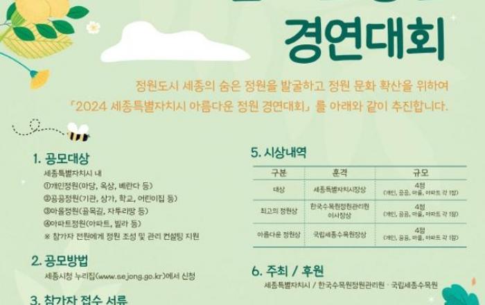세종특별자치시가 도심 곳곳에 숨어 있는 아름다운 정원을 찾기 위해 ‘2024 세종특별자치시 아름다운 정원 경연대회’를 개최한다. 이번 경연은 지역의 숨어 있는 아름다운 정원을 발굴해 정원도시 세종의 정원관광 자원을 확보하고 생활 속 정원 가꾸기에 대한
