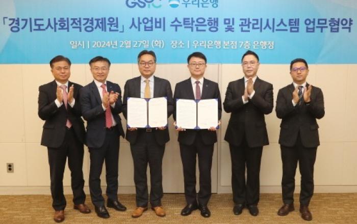 경기도사회적경제원은 우리은행과 ‘사업비 수탁은행 및 관리시스템 업무 협약’을 27일 체결했다. 이날 협약식에는 경기도사회적경제원 유훈 원장과 우리은행 조세형 부행장 등 양사의 주요 관계자가 참석한 가운데, 경기도 내 사회적 기업 지원을 위한 자
