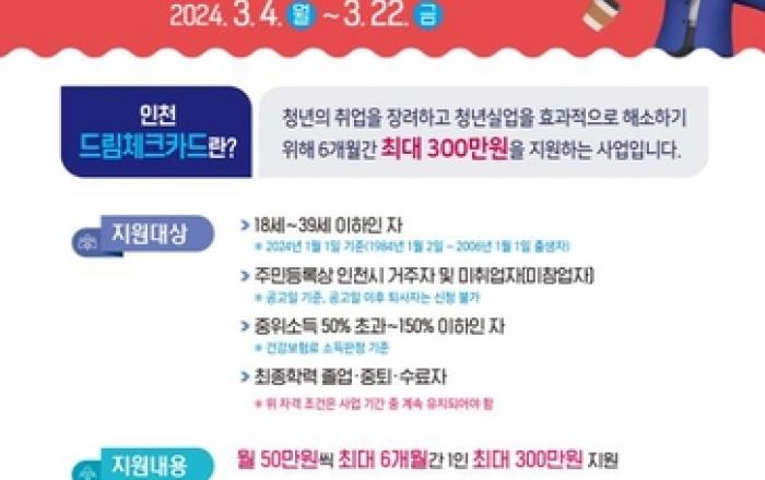 인천광역시는 미취업 청년의 구직활동을 지원하는 '2024년 드림체크카드 사업' 참여자를 3월 22일까지 모집한다고 밝혔다. '드림체크카드'는 경제적으로 어려움을 겪고 있는 미취업 청년에게 구직활동비를 지원해 청년들의 생활 안정을 도모하고, 취업 활동을 돕기 위해 인