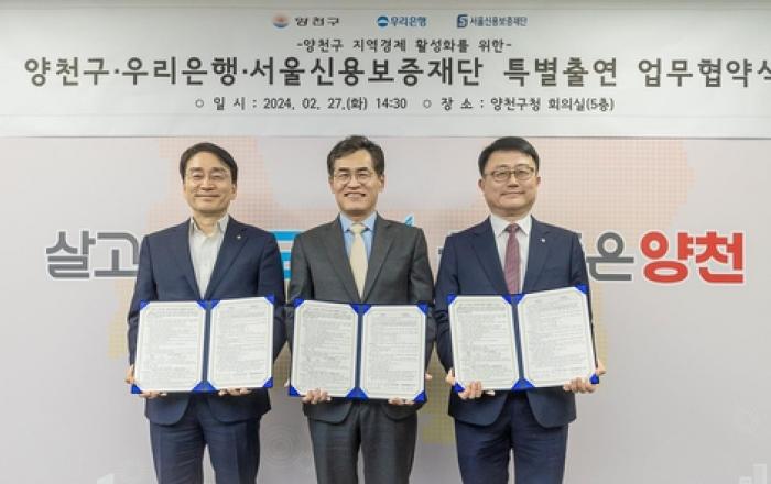 양천구는 경기침체로 자금 조달에 어려움을 겪는 관내 중소기업과 소상공인을 위해 27일 우리은행, 서울신용보증재단과 137.5억 규모의 '지역경제 활성화를 위한 특별출연 업무협약'을 체결했다고 밝혔다. 이번 협약을 통해 구는 1억 원, 우리은행은 10억 원 총 11억