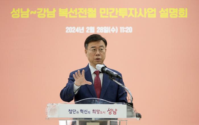 신상진 성남시장은 28 일 시청 한누리실에서 성남 ~ 강남 복선전철 민간투자사업 설명회를 갖고 현재 추진 중인 지하철 3