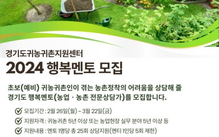 경기도와 경기도농수산진흥원이 운영하는 경기도귀농귀촌지원센터가 ‘2024 행복멘토·멘티’ 사업을 진행할 행복멘토를 3월 22일까지 모집한다. 경기도 귀농귀촌 행복멘토·멘티 사업은 초보귀농귀촌인의 각종 어려움을 해결하고 시행착오