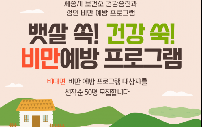 세종특별자치시 보건소가 성인 비만 예방·관리를 위한 ‘뱃살 쏙! 건강 쑥!’ 비대면 프로그램을 운영한다. 이번 사업은 자기 주도적 건강생활 습관 형성을 유도하기 위해 마련됐다. ‘워크온’ 앱을 통해 운동과 식이조절 프로그램을 제공하며 사전·사후 검사
