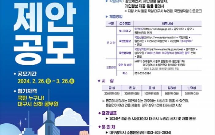 대구광역시는 전 국민 및 대구시 산하 공무원의 창의적인 아이디어를 발굴해 시정에 적극 반영하기 위한 ‘2024년 제1회 정책제안 공모’를 추진한다. 공모 주제는 ▲달빛철도와 연계한 대구시 발전 아이디어 ▲동성로 부흥을 위한 활성화 방안 ▲미래형도시 대구를 만들기 위한