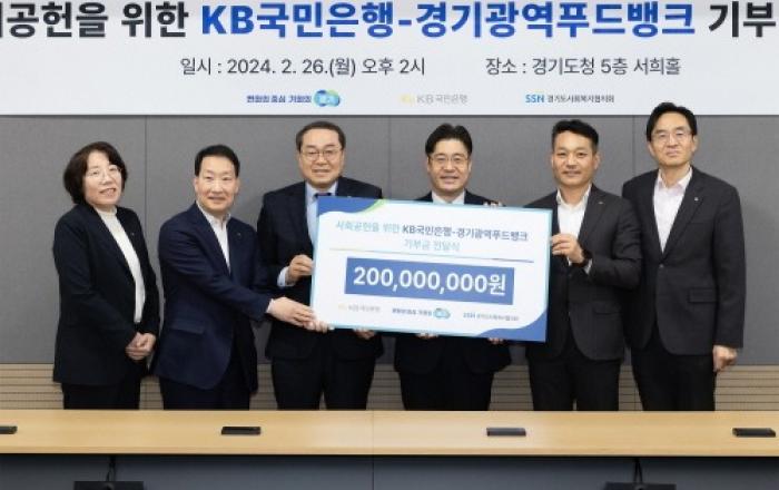 경기도와 경기도사회복지협의회(경기광역푸드뱅크)가 도내 사회 취약계층의 따뜻한 밥상 차리기를 돕기 위해 KB국민은행으로부터 기부금 2억 원을 전달받았다. 기부금 전달식은 26일 오병권 행정1부지사, KB국민은행 김진삼 부행장,