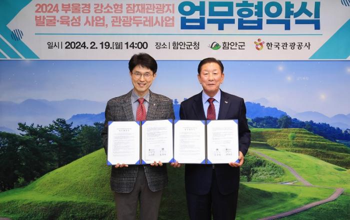 함안군은 한국관광공사 부산울산경남지사가 주관하는 2024년 '강소형 잠재관광지 발굴·육성 사업' 및 '관광두레 사업' 공모에 최종 선정돼 19일 업무협약을 체결했다고 밝혔다. ▲ 조근제 함안군수는 "2024 강소형 잠재관광지 및 관광두레 사업 선정과 한국관광공사 부울경